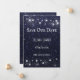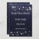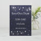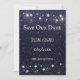 Personalize um anúncio de casamento único com uma Noite Estrelada Salve a Data. Design de lançamento mostra um céu noturno adornado com estrelas brancas e texto que você pode personalizar com seus detalhes de data de casamento. Salve ainda o anúncio de data disponível para este design em várias cores.