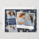 Cartão com fotos Chanucá bonito apresenta uma faixa de fotos com duas fotos e um painel de texto azul marinho, além de um instantâneo inspirado por câmera instantânea com uma legenda manuscrita. Personalize com o ano e seu nome de família ou mensagem personalizada, em um fundo azul marinho pontilhado com flocos de neve desenhados à mão e estrelas azuis e douradas.