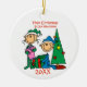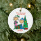 Homem-figura-palha e mulher, uma árvore de férias, e texto vermelho que lê Primeiro Natal em Nossa Nova Casa com uma data personalizável.
