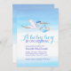 Convite para chás de fraldas bonitos, com pintura de aquarela fofa de uma cegonha-branca a entregar um novo bebê. Convites de chuveiro de bebê novo e caprichoso. Personalize com os detalhes do seu chá de fraldas. © Pintura única em aquarela e projetada por Sarah Trett.