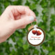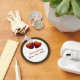 Uma imagem de morangos em forma de coração num chaveiro. O chaveiro tem modelos personalizáveis para o seu texto.