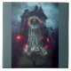 Uma jovem misteriosa de vestido fluente fica em frente a uma mansão gótica com janelas vermelhas brilhantes, colocadas contra um céu escuro e estranho. Árvores negras e morcegos voadores aumentam ainda mais a tensão atmosférica. Digital Art Photoshop CS5