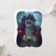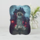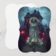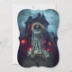 Uma jovem misteriosa de vestido fluente fica em frente a uma mansão gótica com janelas vermelhas brilhantes, colocadas contra um céu escuro e estranho. Árvores negras e morcegos voadores aumentam ainda mais a tensão atmosférica. Digital Art Photoshop CS5