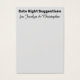 Aqui está um acessório divertido para pegar sua festa de noivado ou chá: cartões de sugestão noturnos de data nos quais os convidados podem escrever notas pessoais para a noiva e o noivo. Na frente, você lê "Sugestões da Noite de Data" em uma fonte ousada, sans-serif; esta fonte é editável para que você possa escolher outra, se preferir... ou até escrever uma mensagem diferente. Abaixo há um lugar para seus nomes; eles aparecem em um roteiro bonito que também é fácil de mudar. Altere o fundo para qualquer cor que você preferir!. Por favor, não hesite em contactar-me se tiver pedidos especiais ou necessitar de outros pontos. Também me apraz ajudar na personalização destes cartões, se for necessário.