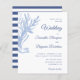 Crie convites para casamentos de orçamento para eventos costeiros de praia com design azul e branco na moda que é decorado com pintura de algas aquáticas e tipografia moderna, e o padrão listrado no verso. É também uma ideia perfeita para o casamento do tema do mar. O modelo ajuda a personalizá-lo com facilidade - digite seus nomes, localização e local.