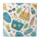 Vibrant seamless summer pattern ceramic tile featuring straw hats, sunglasses, tote bags, sunscreen, flip flops, tropical leaves, and flowers on a clean white background. Ideal for beach lovers, vacation fans, tropical style enthusiasts, and anyone who loves sunny summer aesthetics.