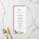 Este verão verde, cor-de-rosa, o cartão do janto de casamento é perfeito para um elegante casamento no meio do verão. O design botânico apresenta um arranjo exuberante de cor d'água pintada, eucalipto, verde e folhas verdes com sutis manchas de flores rosadas e cor-de-rosa. Este menu pode ser usado para recepção de casamento, janto de ensaio ou qualquer evento.