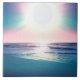 Linda praia tropical com vista colorida ao sol vista foto, apresentando uma surpreendente iridescência de cores do arco-íris ao sol sobre o mar, ondas calmas do oceano azul, areia azul-escura brilhante e um grande e brilhante sol branco, projetando uma mistura de cor rosa, verde, azul, verde-pastel cor costa do horizonte. Este quadro único da natureza original do mar do paraíso tropical traz a qualquer decor uma sensação de um feriado calmo e relaxado de verão.
