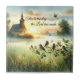 This enchanting artwork captures the serene beauty of a sunrise landscape, where golden morning light floods a peaceful meadow and a quaint wooden church stands silhouetted against the soft mist. A gathering of songbirds perches on dew-kissed branches, adding warmth and life to the tranquil scene. The delicate blend of warm sunlight, lush greenery, and drifting fog evokes a sense of stillness and spiritual reflection, perfect for those who cherish early moments in nature. Rendered in a watercolor countryside style, this piece harmonizes rustic charm with the quiet joy of daybreak. Ideal for anyone drawn to peaceful rural scenes or spiritual sunrise paintings, this design blends the calm of misty meadow art with the uplifting energy of nature awakening. AI generated artwork.