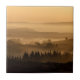 A paisagem romântica de colinas rolantes no brilho laranja macio do nascer do sol.