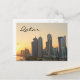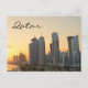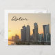 Cartão-postal dos arranha-céus na linha do horizonte do centro comercial de Doha, capital do Catar, país do Golfo Árabe, no pôr do sol, com o tekst: 'Qatar'.