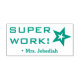 Este design de carimbo motivador apresenta a mensagem motivadora "SUPER WORK!" e um nome de professor personalizado. Ele também apresenta uma forma decorativa de contorno de estrela. Pode ser usado por um professor ou educador ao marcar missões, para reconhecer que o aluno fez um trabalho de excelente.