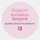 A imagem tem o texto em uma fonte de máquina de escrever: "Suporte / Inclusão / Respeito" em gradações cor-de-rosa; "rede feminina autista" a preto; e abaixo está o logotipo do AWN.