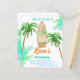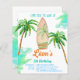 Surfing beach ocean tropical summer birthday budget invitation template. Nice for summer beach themed birthdays. Palm trees and surf board.