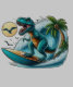 Uma ilustração lúdica de um T-Rex cavalgando uma prancha de surfe em uma onda gigante, com palmeira e gaivotas ao fundo. design divertida e humorística apresentando um dinossauro apreciando o estilo de vida na praia. imagem colorida e dinâmica de uma criatura pré-histórica abraçando o mundo moderno.