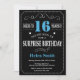 Surpresa 16.º Aniversário Convite Azul e Tipografia Negra. Chalkboard. Fundo preto e branco. Aniversário de criança. Homens ou Mulheres Aniversário. Menino ou Menina Menina Menina Adolescente Convidam. 13 15 de 16º 18º 20 21rua 30 de 40º 50º 80 de 60º 70 de 100º. Qualquer Idade. Para mais personalização, clique no botão "Personalizar" e use nossa ferramenta de design para modificar este modelo.
