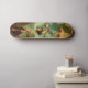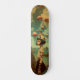 Surreal fantasy wall art skateboard. A girl with short blue hair and bangs, wearing a white cap on her head is standing in the sea surrounded by floating islands. She has many black bandages around one of her arms and wears a skirt that covers part or all of it. The background features a surreal landscape with houses made from mushrooms and clouds hanging over the water.