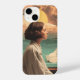 Surreal collage illustration of a woman seated in a retro-styled interior with cosmic waves and dreamlike skies entering through the wall, with a cat at her side.