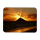 Imagem de foto retangular de souvenir com um sol cor de laranja quente sobre a ilha de Mokulua em Lanikai Beach, Oaha, Havaí, EUA.
