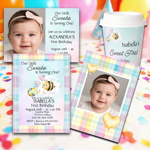 Adorable first birthday Invitation design featuring cute honey bees, soft pastel colors, and a sweet bee-themed aesthetic. Perfect for a “Our little sweetie is turning one” celebration, this customizable design is ideal for first birthday parties, baby celebrations, and bee-themed decor. Personalize with your child’s name, photo, and party details to create a charming and memorable keepsake. Add photo.