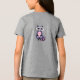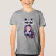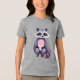 Um guaxinim de desenho com olhos grandes e expressivos e pelo liso é representado sentado sobre suas pernas traseiras. O pelo apresenta tonalidades de cinza e cor-de-rosa, criando um olhar lúdico e caprichoso