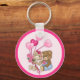 Doce chaveiro com cena romântica com dois adoráveis Teddyurdos. O ursinho tem um buquê de corações de balão e rosas rosa. O rapazinho está olhando para ela com amor.