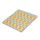 Symmetrical retro pattern with interlocking teal, yellow, and orange shapes on a beige background. Black star-like accents add contrast, creating a vintage feel.