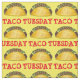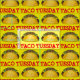 O tecido apresenta linhas de tacos de duro-carapaça estaladiça, com a Taco-TERÇA numa fonte vermelha divertida.