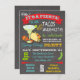 Tacos super legal e modernos e Casais Margaritas indo embora Convite de festas. Faça uma Fiesta mexicana com tacos, tequilla e margaritas com maracas e tipografia divertida contra um quadro negro. Ilustração desenhada à mão por McBooboo.