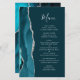 A borda esquerda deste elegante cardápio moderno de casamento apresenta uma cor azul-lacrimogênea agata bordada com falso brilho prateado. O texto personalizável combina o script de escrita manual de cinzas prateadas e as fontes de impressão em fundo negro. O verso apresenta um design de barro e de agata prateado correspondentes.