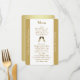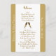 Menu à moda da mesa da recepção de casamento feito no branco, com bandas de um corredor tan do ouro acima de ambos os lados do cartão. Os gráficos de dois vidros do champanhe que brindam, decoram o meio do menu. Personalize o texto branco que funcionam abaixo dos lados e o texto do tan do ouro, no meio, para serir suas necessidades do casamento.