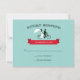 Cartões Rsvp de casamento de bicicleta Tandem com noiva e noiva andando de bicicleta Tandem. Tipografia de safra e faixa vermelha em fundo aqua. Consiga os convites de casamento de bicicleta tandem.