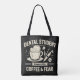 Väskan har ett slitet, retro-inspirerat tryck i benvitt som gör sig bra på mörka tyger. Motivet visar en gullig hjärna och tand som kramas i en kaffekopp, omgivna av instrument och texten "DENTAL STUDENT - Powered by COFFEE & FEAR". Det är en design med hög igenkänningsfaktor för alla som studerar tandvård.