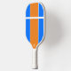 Este design desportivo apresenta uma faixa de corrida vertical laranja tangerina colorida, intersetada por uma faixa horizontal branca esbranquiçada no terço superior da design. As tiras exteriores são azuis.