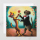 Esta pintura de arte digital gerada por computador mostra um gato e um cão dançando tango em um clube de dança. O cachorro está vestindo um smoking e segurando um rosa. Criada com várias gerações de imagens da fonte IA DALL-E, a pintura foi criada no estilo de Vincent Van Gogh. Esta nova forma de trabalho de arte é divertida para fãs de tecnologia, nova arte e animais de estimação engraçados! Faz excelente aniversário, Natal ou outro presente de feriado.