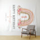 Tapeçaria rústica boêmia de 1º aniversário de menina com fundo branco simples, um adorável arco-íris boho em aquarela, flores cor-de-rosa elegantes e um modelo moderno de "feliz aniversário" fácil de personalizar.