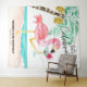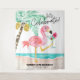 Adicione um clima alegre e praiano à decoração da sua festa de aniversário com esta tapeçaria tropical! Com um flamingo rosa fofo na praia aproveitando um coquetel tropical ao lado de uma palmeira com uma legenda "vamos celebrar" em letra manuscrita moderna e casual. Isso também serve como um fundo fotográfico divertido para você e seus convidados. Arte por KL Stock.