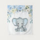 Pano de fundo de chuveiro/berçário de elefante floral azul para menino - Este design apresenta uma ilustração de aquarela de peônias, anêmonas e adorável elefante bebê em azul suave, cinza e creme. No topo - confetes com efeito prateado que podem ser removidos.