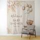 Tapeçaria boêmia de chã de bebê com urso, apresentando um fundo marrom claro, um urso de bebê menino em aquarela vintage, balões, grama pampas rústica boho e flores, além de um modelo de texto moderno fácil de personalizar.