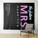 Tapeçaria personalizada moderna "The Future Mrs" preta para a sua despedida de solteira, com "the future" e "MRS" escritos em azul teal e rosa quente com efeito de luzes de neon. Você pode personalizar com o nome de casada futuro, primeiro nome e data da festa. O canto inferior é deixado em branco para uma área para que seus convidados tirem fotos.