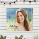 Exiba uma foto personalizada do seu graduado do ensino médio ou faculdade com estilo com este tapete suspenso na parede / placa de festa de formatura. Design simples e minimalista apresenta uma foto do graduado, acentuada com uma sobreposição de texto em script moderno e elegante com o nome do graduado e ano de formatura. A cor do texto preto e os estilos de fonte podem ser modificados.