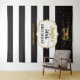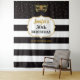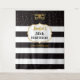 Esta é uma tapeçaria de festa de aniversário moderna e elegante com máscara preta e dourada e letras de caligrafia engraçada