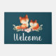 Um tapete de porta bem-vindo com 2 raposas vermelhas. Um de pé no outro deitado. Desenhado com aquarela.
