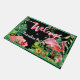 Personalizável (cor de fundo e texto de nome) Matriz de boas-vindas Flamingo. Coral bonito, amarelo-sol e cores verdes da selva predominam em um paraíso de folhagem e flores. Saudações tropicais recebam seus convidados. Esta é uma versão espelhada do Flamingo Paradise original com diferentes posicionamentos e cor preta de fundo contrastante.