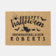 Doormat clássico e elegante do Dia das Bruxas para a queda - "texto do Dia das Bruxas feliz" com bastões, uma bruxa do vôo, uma aranha, e seu nome de família