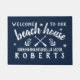 " Boa vinda texto à nossa casa de praia" com pás da canoa, âncoras, estrela do mar, e seu nome de família - fundo escuro de serapilheira do falso dos azuis marinhos com branco