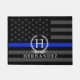 Um doormat conhecido Monogrammed e feito sob encomenda que caracteriza uma linha azul fina polícia denominou a bandeira americana. O monograma é centrado dentro de uma grinalda estilizado branca com o texto do sobrenome no texto branco embaixo. Uma maneira elegante e à moda de fazer uma impressão em sua entrada ao representar o azul.