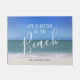 Esta porta é perfeita para qualquer praia ou lago. Ele apresenta uma bela foto da água azul-lacrimogênea e areia branca que preenche toda a porta. O texto branco no topo da foto diz: A vida é melhor na praia. O texto personalizado permite personalizar com seu nome.