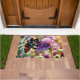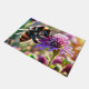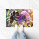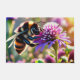 Uma abelha vibrante paira delicadamente sobre uma flor roxa florescente. O corpo listrado da abelha contrasta com as pétalas moles, destacando a beleza da polinização.