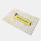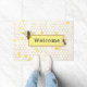 O tapete de porta de boas-vindas apresenta o fundo do ouro honeycomb, ilustrações de abelhas de vintage de cor e caixa de texto personalizável central.